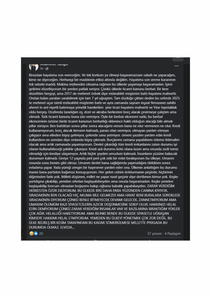 Birazdan hayatıma son vereceğim. Ve tek korkum ya ölmeyi başaramazsam sabah ne yapacağım, kime ne diyeceğim. Herhangi bir maddenin etkisi altında değilim. Hayatıma son verme kararımın tek sebebi maddi. Makina mühendisi olmama rağmen bu ülkede yaşamayı başaramadım. İşimi gelirimi düzeltiyorum bir yerden patlak veriyor. Çünkü ülkede ticaret kanunu berbat. Bir kere düzelttim herşeyi, ama 2017 de mehmet özbek diye müteahhit müşterim battı hayatımı mahvetti. Ondan kalan yaraları sarabilmek için tam 7 yıl uğraştım. Tam düzlüğe çıktım dedim bu seferde 2025 te mehmet uçar isimli müteahhit müşterim battı ve aynı zamanda sayram inşaat firmasının sahibi ahmet in ard niyetli batırmaya yönelik hareketleri yine ticari hayatımı mahvetti ve Yine tepetaklak oldu herşey. Etrafımda tanıdığım eş, dost ve akraba herkesten borç alarak çevirmeye çalıştım ama olmadı. Türk ticaret kanunu buna izin vermiyor. Öyle bir berbat ekonomi varki, bu berbat ekonominin üstüne birde ticaret kanunun berbatlığı eklenince haklı olduğun alacağı bile almak yıllar sürüyor. Ben battıktan sonra yıllar sonra alacağımı versen bana ne olur vermesen ne olur. Kredi kullanamıyorum, borç alacak kimsem kalmadı, parası olan vermiyor, olmayan yardım etmeye çalışıyor ama elinden bişey gelmiyor, gelende sana yetmiyor. cimere yazdım yardım edin kredi kullandırın en azından diye ordanda bişey çıkmadı. Borçlarımı zamana yayabilsem ödeme ihtimalim olacak ama artık zamanada yayamıyorum. Devlet çıkardığı tüm kredi imkanlarını zaten durumu iyi olanın kullanabileceği şekilde çıkarıyor. Kredi asıl durumu kötü olana lazım ama onunda sicili temiz olmadığı için krediye ulaşamıyor. Artık hiçbir şeyden umudum kalmadı. İnsanların yüzüne bakacak durumum kalmadı. Geriye 12 yaşında pırıl pırıl çok zeki bir evlat bırakıyorum bu ülkeye. Umarım onunda sonu benim gibi olmaz. Umarım devlet bana sağlığımda yapmadığını öldükten sonra evladıma yapar. Yada yüreği zengin bir hayırsever yardım eder ona. Ülkenin anlattığım bu durumu inanın bana partiden bağımsız konuşuyorum. Her gelen cebini doldurmanın peşinde, hiçbirinin diğerinden farkı yok. Milleti düşünen, millet ne yapar nasıl geçinir diye dertlenen kimse yok. Keşke yurtdışına çıkabilip, yeniden sıfırdan başlayabilseydim ama onuda başaramadım. Keşke yeniden başlayabilip borcum olmadan boğazımı bakıp oğluma babalık yapabilseydim. ZARAR VERDİĞİM HERKESTEN ÖZÜR DİLİYORUM. BU ÜLKEDE BİRİ DAHA PARA YÜZÜNDEN CANINA KIYIYOR. SIRADAKİNİN BEN OLACAĞI HİÇ AKLIMA BİLE GELMEZDİ AMA HAYAT BENİ BURALARA SÜRÜKLEDİ. SIRADAKİNİN DİYORUM ÇÜNKÜ BENLE BİTMEYECEK DEVAMI GELECEK. ZANNETMİYORUM AMA UMARIM ÖLÜMÜM BAZI SİYASETCİLERİN AZICIK DÜŞÜNMESİNE SEBEP OLUR. HAKKINIZI HELAL EDİN DEMİYORUM ÇÜNKÜ ZARAR VERDİĞİM İNSANLAR VAR VE BAZILARINA BIRAKTIĞIM YÜKLER ÇOK AĞIR. HELALLİĞİ HAKETYORUM. AMA BİLİNKİ BENDE BU ÜLKEDE SİYASETLE UĞRAŞAN KİMSEYE HAKKIMI HELAL ETMİYORUM. YEMEDEN BU ÜLKEYİ YÖNETMEK ÇOK ZOR DEĞİL. BU ÜLKE BELİRLŞ BİR KESİM TARAFINDAN BU KADAR SÖMÜRÜLMESE MİLLETTE PİYASADA BU DURUMDA OLMAZ. ELVEDA…